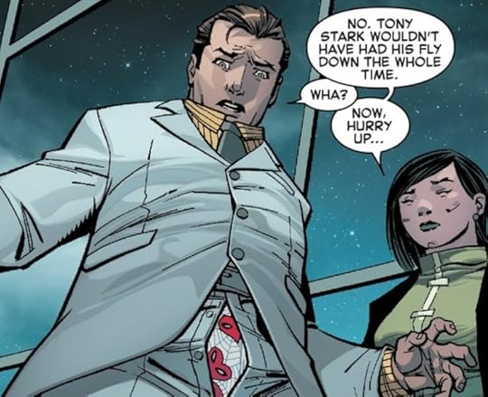 I admit, I haven't read Secret Wars, so I'm assuming that the status quo changed in that story ... but Spider-man as a rich white dude's bodyguard? And everyone is fine with this? No Queens and Brooklyn natives feeling like he sold out? Nope, everyone's totally fine with it. Like it's normal. Rich white dudes get superhero bodyguards now. Good to know.