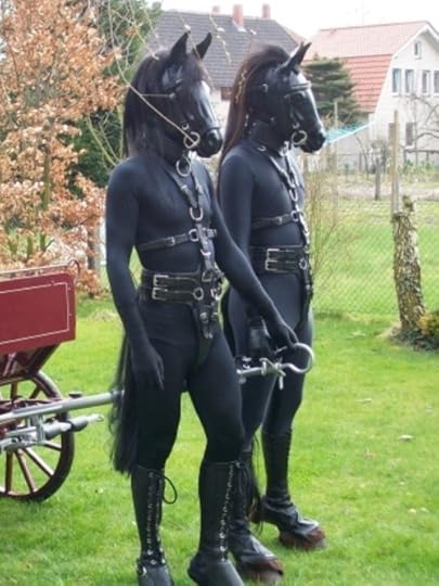 Photo Description: Two men are wearing black body suits. Where the suits end their skin is coloured black to match. Over their heads are realistic horse masks, complete with bridles. One has a slightly lighter mane. They have body harnesses around their chests and waists, which loop underneath between their legs. You can also just see the first man’s pony tail. They wear black boots to just below the knee, which are hooves at the shoe.