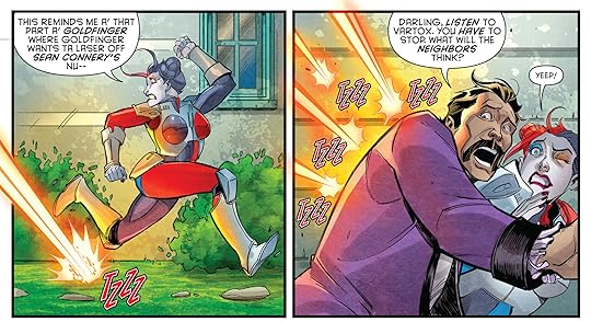 Well, this is sillier than a soup sandwich but it acknowledges that and makes fun of itself and doesn't try to be anything more, so therefore it succeeds quite well in being what it is. How's that for nonsensical commentary? The theme is sexual innuendo on a seventh grade level, but it's all pretty amusing and entertaining and all in good fun. There are some genuinely funny bits of banter ("feels a bit like filler"!), and although it lacks much in the way of plot, it's good for some chuckles. The art is quite bright and slick and enjoyable, although Harley's face looks just Mercury from early 1960's Metal Men in a few panels. It was a good book to read during commercials while the hockey game was on.