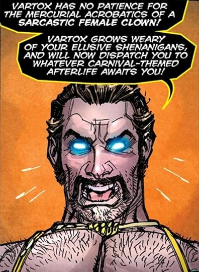 Vartox is back baby. He's a character from the Power Girl series, pre-new 52, who's based on a terrible Sean Connery movie from the 70's, Zardoz. The story spins out of Harley Quinn #12 where Power Girl has amnesia and Harley convinces her they are partners in fighting crime. The series is funny and action-packed with great art from Stephane Roux.