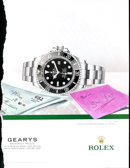 What I particularly liked are his magazine creations. Tearing out regular ads in magazines or newspapers, in these too, he offsets again the lives of the workers against their luxurious working environments. "Maria's paycheck", 9 x 11 in. Acrylic and ink on magazine, 2014
