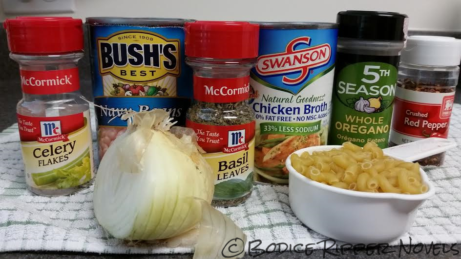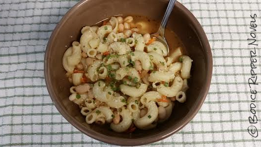 This soup has macaroni, carrot, onion, beans, oregano, basil, and tomatoes in it. I doubled the recipe to make two servings and made it in a 2qt. pot instead of two jumbo mugs. I used celery flakes in place of fresh celery, tomato paste in place of tomatoes, since I don't like them, and I used onion in place of scallions. I used half the amount of dried oregano and way less basil. I sprinkled dried chives on top for color.