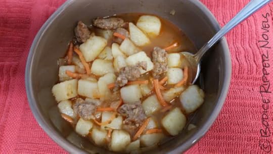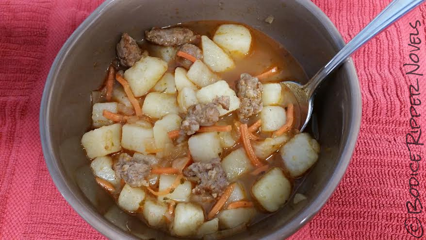 This Mexican soup uses raw Italian sausage instead of meatballs, carrot, celery, potatoes, cumin, oregano, and onion. I omitted diced zucchini, a diced chile, and diced tomatoes. I used some tomato paste in place of tomatoes. I made this in a 2qt. pot instead of two jumbo mugs in the microwave. The flavoring is off in this but it's edible. The Italian flavoring clashes with the cumin or something. I wouldn't make this again.