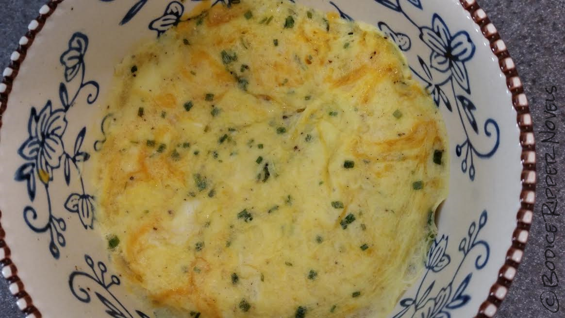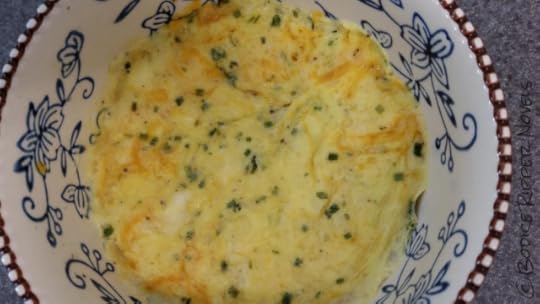Boy, was this easy to make. I used two jumbo eggs, milk, butter, dried chives in place of scallions, left out the thyme, used half the amount of shredded cheese, salt, pepper, and cooked it for 2 minutes. As you can see the chives rose to the top. It was a little undercooked on the bottom so I put it in the microwave upside down on a plate for 20 seconds. It still wasn't cooked so I gave it another 20 seconds and it was cooked through on the bottom but the sides were very tough but the inside was moist. I'll experiment with this so that it's not overcooked again. I'll also use a smaller bowl. You'll need one with a 1 1/2 c. capacity. The photo on the bottom is the cooked egg upside down on a plate.