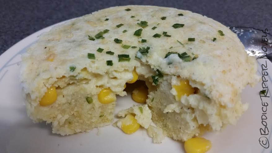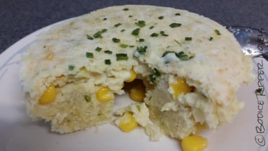 Not good, folks. I microwaved this in a 3 cup bowl, not two jumbo mugs. It's extremely dense and tastes like nothing more than cornmeal with a little onion flavor from dried chives, which I used instead of scallions. The bottom had a raw area and there were pockets of raw egg inside. The corn just falls out of it too when you cut into it. I was able to eat most of it but I wouldn't make again. You have to use several bowls to make this too.