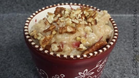 This is a really good, basic recipe. Just butter, oats, milk, apple, sugar, and cinnamon. I made this in a bowl, not mug, then transferred it to a 5 oz. ramekin and sprinkled chopped lightly toasted pecans on top. I used white sugar in place of brown, quick oats in place of old fashioned, a few dashes of cinnamon instead of 1/4 teaspoon, which is beyond too much, and added a large pinch of salt before microwaving because salt is extremely necessary when cooking oats. I cooked this for the full amount of time, 2 1/2 minutes, but it was overcooked. It makes a small serving but it's enough because it's more like a dessert.