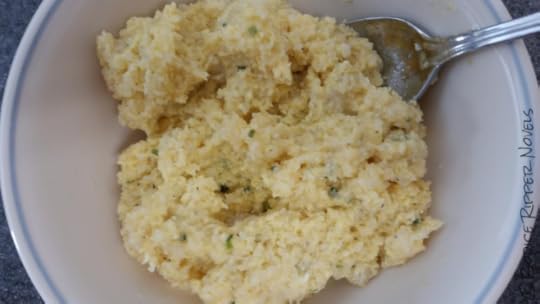 These were surprisingly good. They don't taste like corn or egg at all, just cheese and chives. I made mine in the bowl I eat cereal in, 1 1/2 c. capacity. You use a small amount of quick cooking grits (corn meal made from hominy for Quaker® brand) and water, microwave a short time, let the mixture sit, microwave again, add in egg, cheese, flavorings, and microwave until risen and firm.