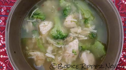 This recipe is called Split Peas and Ham. You're supposed to mash up a drained and rinsed can of split peas, add some water to thin it slightly, ham, salt, pepper, onion, and garlic. I used part of a can of navy beans and some drained canned white meat chicken instead. I also added broccoli and used a 14.5 oz. can of low sodium chicken broth plus 1/2 c. of water to make two large servings.