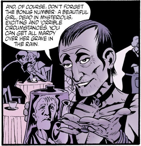 For several years I've had an idea for a hypothetical scale for graphic violence and grimness in prose fiction: the Dora Suarez Scale, after I Was Dora Suarez, British writer Derek Raymond's 1990 crime novel which infamously made the author's previous publisher throw up over his desk and reject the book. However, as I've not read Dora Suarez and am unlikely to, points on the scale remain vague at best. Hellblazer had previously been quite gory at times - it is a horror comic, after all - but it was only when I got to Ellis' run that I started thinking about the Dora Suarez Scale. It's grim, it's graphic. Verbal descriptions of murders (including of one of Constantine's exes by the sadistic dark magician who was her subsequent boyfriend) made me wonder how this sounded to people who, a couple of years earlier, had read detailed newspaper accounts of the torture and murders carried out by serial killers Fred and Rose West: not quite as horrific to read because briefer, more so, or similar. (In the 90s that was definitely the most graphic account of such stuff I'd ever read, and, still in my late teens, I hadn't realised national newspapers would print that sort of thing.) This stuff is not shown in detail in the illustrations, of course. Given the references to Raymond's Factory novels that had always floated about the darker end of British indie culture, so it perhaps wasn't surprising to read in Vertigo Secret Files and Origins (collected in vol.14) that Ellis cited them as an inspiration "there's a certain strain of British crime fiction that's not been seen in American comics, a kind of murder writing that's blacker and sadder than [James] Ellroy. Derek Raymond's 'Factory' novels are the obvious touchstone, brutal things without a chink of light in them."
