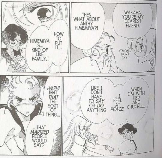 I really love that Utena actually conforms to societal expectations of femininity in this volume when she falls into despair and it really feels like she is trying to play the part of "what a girl should like/be". And yeah, maybe some women feel empowered by wearing dresses and skirts and feeling like a princess. But not Utena. This volume really shows that.