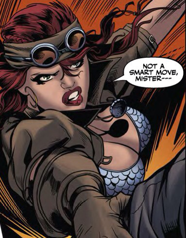 É melhor que a da Vampirella. Mas também tem o Capitão Nemo zumbi arrancando a cabeça de um tubarão. Pouca coisa é melhor que um personagem clássico fortemente descaracterizado como um morto vivo que usa um turbante, aparentemente, impermeável arrancando a cabeça de um animal selvagem para salvar o Demonhão Ruivão caracterizado com uma pirata que se envolveu em um plano para a dominação mundial do nosso cientista maluco favorito, Doutor Frankenstein. A ruiva tá bem melhor caracterizada e os desenhos são bem mais interessantes também, o problema é que não tem picas de steampunk como prometia o título, mas tem o Capitão Nemo zumbi arrancando a cabeça de um tubarão. Então acho que vale a pena.