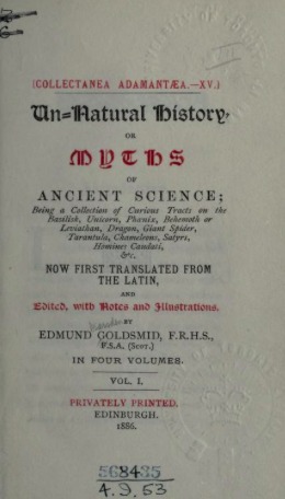Un-Natural History, or Myths of Ancient Science; Being a Collection of Curious Tracts on the Basilisk, Unicorn, Phoenix, Behemoth or Leviathan, Dragon, Giant Spider, Tarantula, Chameleons, Satyrs, Homines Caudati, &C., Now First Tr. from the Latin, and Ed