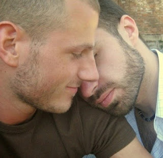Photo Description: Two men embrace one another, while one leans his head against the other one’s shoulder. They’re both smiling, looking happy and content.