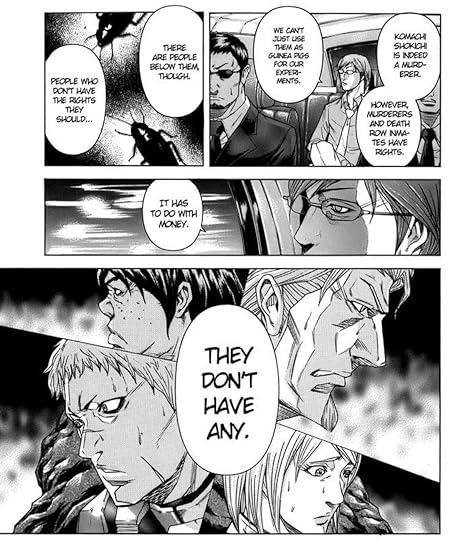 Tedious and nasty sci-fi manga about super-powered losers fighting evolved humanoid cockroaches. Advantage cockroach, as it happens - this is a Suicide Squad type of setup where you shouldn't get attached to any characters. (The writing and art are a great help in not letting such bonds form.) The endless violence is not gratuitous - it's the whole point of the comic - but the glib misogyny is. The whole thing reads and looks like an early 90s Image rip-off with more gore, and has won a big post-Attack On Titan audience of fans who don't mind their nihilistic adrenalin rushes cut with liberal amounts of comics baking soda and dog worming tablets.