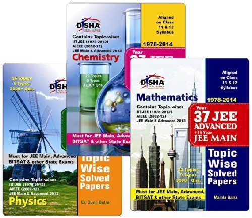 Book 1: Mathematics 1978-2012 IIT-JEE and 2013-14 JEE Advanced + 2002-2012 AIEEE and 2013-14 JEE Main divided Trigonometric Functions and Equations Complex Quadratic Equation and in equations Permutations and Combinations Mathematical Induction and Binomial Theorem Sequences and Series Straight Lines and Pair of Straight Lines Circles Conic Sections Functions Limits, Continuity and Differentiability Differentiation Properties of Triangle Inverse Trigonometric Functions Matrices and Determinants Applications of Derivatives Indefinite Integrals Definite Integrals and Applications of Integrals Differential Equations Vector Algebra and Three Dimensional Geometry Probability Miscellaneous (Sets, Relations, Statistics and Mathematical Reasoning) 2014 JEE Advanced Question paper and Solutions 2014 JEE Main Question paper and Solutions Book 2: Physics 1978-2012 IIT-JEE and 2013-14 JEE Advanced + 2002-2012 AIEEE and 2013-14 JEE Main divided Units and Measurements Motion Laws of Motion Work, Energy and Power Momentum and Impulse Rotational Motion Gravitation Mechanical Properties of Solids and Fluids Heat and Thermodynamics and Gases Simple Harmonic Motion Waves Electrostatics Moving Charges and Magnetism Electro Magnetic Induction and Alternating Current Ray and Wave Optics Modern Physics 2014 JEE Advanced Question paper and Solutions 2014 JEE Main Question paper and Solutions Book 3: Chemistry