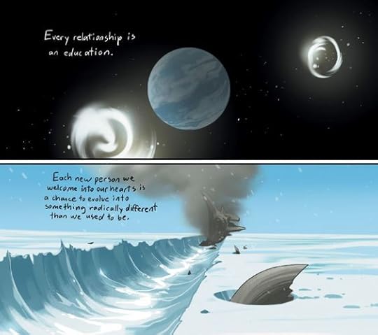 1. This series literally has the best covers. 2. It's like fantasy/superhero/love story/sci-fi/drama/comedy. All genres in one. 3. The art is captivating and tells a story. 4. The little side frames of Hazel's narrations is pretty great. 5. I feel like people will soon have Alana's haircut. And grow horns like Marko. 6. Basically all of the first and last pages of these are genius. 7. A few years until she sees her family???!?!!! NOOOOOOOOOOOOO! 8. Marko and Alana are reunited!!!!!! 9. The Will is better! Yet, way damaged. 10. The TV head killer is dead! 11. The Stalk is dead. Noooooo. 12. I love Hazel’s pineapple outfit. 13. Love this quote: “Every relationship is an education. Each new person we welcome into our hearts is a chance to evolve into something radically different than we used to be.”