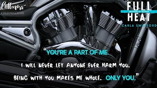 Full Heat is the second book in the Brothers of Mayhem series by Carla Swafford and after reading it, I am tempted to pick up the first novel in the series because my goodness it is spicy. Not for the tame of heart, Full Heat brings the explosion of chemistry that is created when a hot,alpha male motorcycle club president and timid yet free-spirited, good girl gone bad meet and their world's collide. Now I know what you are thinking..hasn't this been done before?