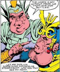 It's the approach to death that really sets the series apart, but honestly, I slowly became a fan of the Horde as well. Visually, they're entirely ridiculous, as their chins look like, well, scrotums. Their culture is a mish-mash of alien warrior races, but it comes down to basically Klingons without the honour. And the lettering choice that signifies their speech is done in such a way that it made it actually hard to read them. Their idea of a successful raid is collecting kitsch and souvenirs that they can proudly wear on their battle costumes. I don't think they go so far as to show a Horde warrior in Mickey Mouse ears, but such a warrior would't be out of place. They're a scavenger species who don't really understand their own war-tech--it's stuff they've stolen from other species.