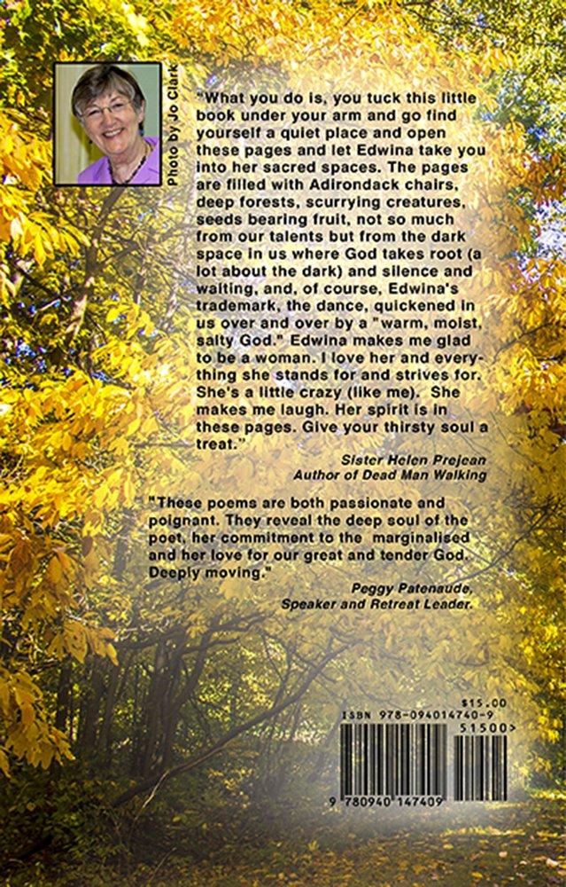 New Revised Edition 2013 "What you do is, you tuck this little book under your arm and go find a quiet place and open these pages and let Edwina take you into her sacred spaces. These pages are filled with Adirondack chairs, deep forests, scurrying creatures, seeds bearing fruit, not so much from our talents but from the dark space in us where God takes root (a lot about the dark) and silence and waiting, and, of course, Edwina's trademark, the dance, quickened in us over and over by a "warm, moist, salty God." Edwina makes me glad to be a woman. I love her and everything she stands for and strives for. She's a little crazy, (like me). She makes me laugh. Her spirit is in these pages. Give your thirst soul a treat." (Review by Sister Helen Prejean, author of Dead Man Walking).