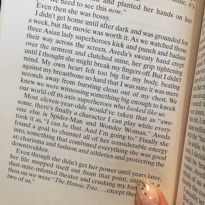 - ASIAN!!! SUPERHEROINES!!! - I loved how fun this book was. Nothing wholly serious, though there are some very serious moments, but it was just so entertaining. I haven't had so much fun reading in awhile. - In between solving demon mysteries and kicking demon butt, it's also a great book about friendship, love, finding yourself, and courage. - The humour in this book is so refreshing and wonderful. There were some moments where I genuinely laughed - and it was mostly because of Aveda's diva complex! - I adored Nate and really related to him. GIVE ME FACTS AND SCIENCE AND SPREADSHEETS. I am here for Nate's dorky scientific mode.