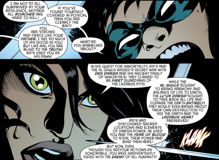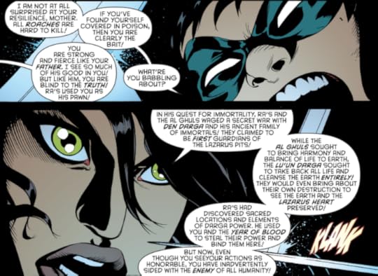 The very first moment he met her again after they were both resurrected from the dead, he did not even hesitate to put mommy dearest back into the grave where she belonged. Because fuck that; he's not looking forward for any heartfelt reunion from the woman who put him under in the first place. Talia found this justifiable but she was also annoyed of her son's badly timed hissy fit because there are more important evils to battle, namely the new type of shit that her own son has unwittingly unleashed by trying to eradicate his Year of Blood crimes. They had a short-lived duel in which Talia tries to enlighten him with this clusterfuck: