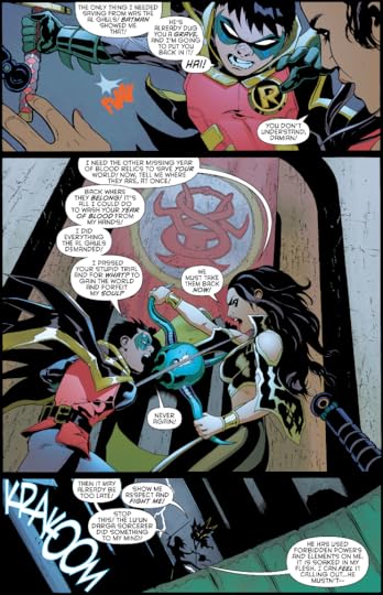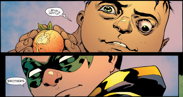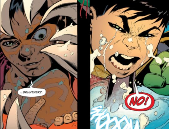 And hell was unleashed a few seconds after that debriefing. Meanwhile--earlier this issue--Damian introduced Maya to his brothers--the genetic clones whom he had freed and gave a home to in a remote island. It was such a touching moment. I was glad Gleason brought these cutie pies back. I mean just look at this sweet and poignant exchange between the Damians: