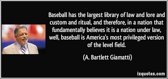 It breaks your heart. It is designed to break your heart. The game begins in the spring when everything else begins again, and it blossoms in the summer, filling the afternoons & evenings, and then as soon as the chill rains come, it stops & leaves you to face the fall alone. You count on it, rely on it to buffer the passage of time, to keep the memory of sunshine & high skies alive, and then just when the days are all twilight, when you need it the most, it stops. Today, a Sunday of rain & broken branches & leaf-clogged drains & slick streets, it stopped, and summer was gone. Somehow, the summer seemed to slip by faster this time. Maybe it wasn't this summer, but all summers that have slipped by so fast.Giamatti seems to assign such intense meaning to the game of baseball, employing the game as a tonic, with "the green fields of the mind" serving as a tool to deal with the forces of change and aging, as well as the long winters without baseball games to fall back on. But what could one expect from a man who left the presidency of Yale University to become the commissioner of baseball, not considering this move anything but a step up. He uses a particular heartbreaking playoff loss by the Red Sox to the Yankees to speak of a "rough justice, how slight & fragile are the circumstances that exalt one group of human beings over another." Giamatti goes on to write that the game....