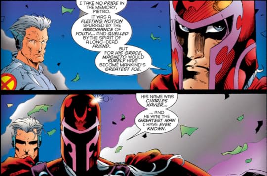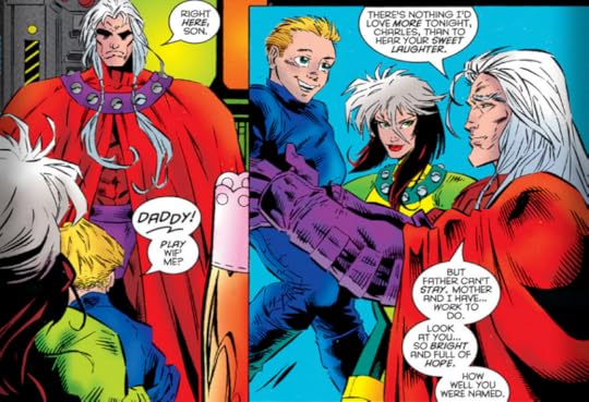 That being said, the one consistent thing that I have enjoyed about Age of Apocalypse is this version of Magneto; the benevolent mentor and idealist for the X-Men who wishes to defeat Apocalypse for the good of both human and mutant kind. He's driven, caring and adorably self-aware, often brooding over the death and legacy of Charles Xavier, his friend who sacrificed himself for Erik so Erik feels obliged to make his late friend's dream about a better world come true. His relationship with his son Pietro, his colleagues Sabretooth and Morph, and marriage with Rogue are actually depicted in a flattering light. There is trust among these characters--too bad that they're only featured a good quarter of a time in this three hundred sixty-seven-paged motherfucker.