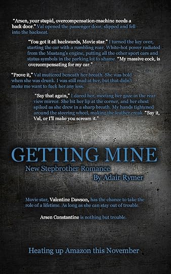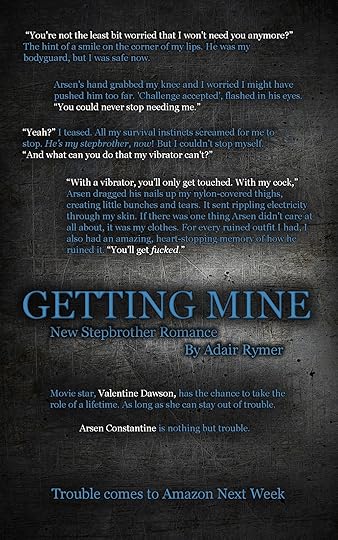 Getting Mine was definitely a different read for me from Adair Rymer as I was used to her badass biker books. This story has more of a NA feel to it. The story revolves around Arsen & Valentine (Val), two high school kids who were just getting to the point of where they could have been considered a couple. As fast as Arsen came into Val's life, he was suddenly and without warning, gone. Fast forward six years ~ Valentine is a famous actress easily manipulated by her famous father (also an actor) and a bit hardened by the shallow lifestyle of entitlement and the desertion of Arsen, which she never quite got over. Arsen is now Val's bodyguard as her life is in danger. Oh, did I mention that Arsen and Val are step-siblings? The development of Val's father and Arsen's mother wasn't brought to light in the course of the story other than the fact that they were married. As Arsen and Val maneuver through unchartered waters of why and how their lives are what they are, one thing that's never changed was their love for each other. In order for the story to make sense, the chapters move back and forth from past to present, allowing the reader a chance to see how the past affected the present. There were some twists and turns which added some thrilling moments. I had a bit of a hard time connecting with some of the characters, mainly Val and her father, Hugh. The book was well written as Adair Rymer is a brilliantly talented author ~ I would absolutely recommend this read if you like early adult fiction. I was given this ARC for an honest review and thank you for that.