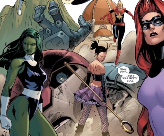 Welcome to feminist paradise Arcadia on Battleworld, policed by A-Force, an all-female superhero team led by She-Hulk. They do it right, not like dumb men! Then a series of disasters happen and She-Hulk’s leadership is challenged. Stuff is going on - what’s gonna happen next? Fart.