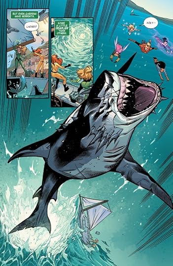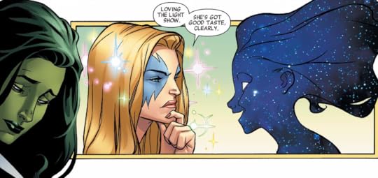 This was terrible, guys. The story is bollocks: a shark attacks, portals appear, a cosmic being called Singularity’s flying around, it’s all part of some ridiculously abstract plan by the most obvious villain, not that any of it makes a lick of difference in the long run anyway. Also regardless of this being an all-female book, it’s still full of brainless punching scenes - sisters fighting sisters! Brilliant nuanced takes on the characters. I guess if women ruled the world it wouldn’t be that much better after all.