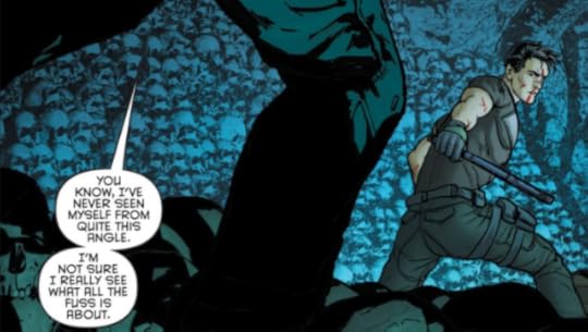 Those are the broad problems with the book, but on a slightly different note let's go on a brief digression about Dick Grayson's ass. In all three volumes of Grayson, the titular character is put on sexual display to the greatest extent possible. Scenes of him standing around are most frequently done with his butt front and center, when flying through the air he often contorts himself so that his rippling chest and rear end are visible to the reader, he is constantly shirtless for absolutely no reason, he is repeatedly shown doing things like working out in boxers or changing his clothes, and an entire issue has a quartet of teenaged girls talking about how attractive they find his hindquarters (to the point of giving each cheek a name). There's also clear gay subtext thrown in by the homosexual character Midnighter, directed toward Grayson by an imposter and vice versa, and from Grayson toward his male partner, while still showing him as a virile guy that knows exactly how to please a woman. I bring this up because I am clearly not the intended audience for this book, it was obviously looking to appeal to the female gaze, though I would bet money that there's a big gay male following for this title as well. Now, you might be assuming (incorrectly), that this is a complaint, but quite the contrary: I think it's great. For years prudes have been complaining about sexy female characters being drawn to please a straight male reader base; well, now here's the reverse for the distaff readership. Enjoy, ladies (and gay men), because there's nothing at all wrong with books parading around sexy characters, male or female.