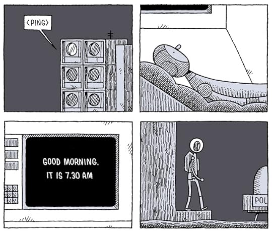 This is my third book from Gauld, the London Guardian cartoonist. I loved the spare and wonderful Goliath, and the funny collection of cartoons, You're All Just Jealous of My Jetpack, and I like living in Gauld's spare sweet melancholy worlds. The moon here is very stark and still empty after a number of years, and people there are already being replaced by robots, not needed. . . maybe the grand lunar experiment may be coming to an end, surprise, surprise.