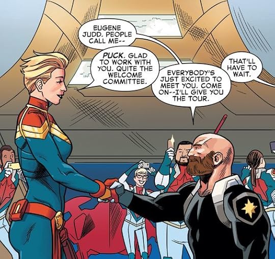 No matter how much I want Mar-Vell back... cuz well, I grew up reading Captain Marvel, I don't see him coming back with Carol here having a movie coming up too. I'd expect Marvel would put their A game for the comic, this is at best ok. Like.. get this, at some point Puck is asking Captain Marvel for an autograph, and he's like "it's for my sister"... and next panel "ok... it's for me :) " . Queue laughter now.