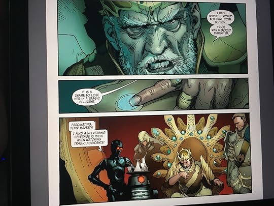 THE GOOD: For all my frustrations, The Sho-Torun War is reasonably better than Shadows and Secrets. I'll begin with the one aspect of this series that has remained fantastic from the beginning, the always wonderful combination of Salvadore Larocca and Edgar Delgado. No matter what level of success Kieron Gillen achieves with the writing, he can always rely on Larocca and Delgado to give it their all with the art. Much like Vader, Star Wars: Shadows and Secrets, and Vader Down, the art has consistently been gorgeous to look at, with great visuals that strike the perfect balance: they capture the dark tone suitable for the character of Darth Vader, but they also have enough brightness and color to exude plenty of personality no matter what the location is. The characters continue to be wonderfully drawn and the action continues to be exhilarating. Darth Vader continues to be a fun character to follow. Despite faltering with most of his recurring characters, Gillen still did a relatively good job with his portrayal of Vader. While he had no new character development, I didn't see Vader out of character at all. Plus, he got to hack and slash some bad guys and had some good dialogue, so I wasn't bored following him. With Dr. Aphra absent, Gillen introduced Queen Trios to fill the role of a strong female character that could work off of him, and she was pretty interesting. Not much character, but it was interesting seeing her try to work with the imposing and frightening Vader. It was also refreshing to follow a character who was actually loyal to the empire, wanting their help in solving a problem, and staying loyal once the problem was solved. It is a welcome and needed take in the Star Wars universe that rather than just another planet or people (shown as the heroes) wanting freedom and making the empire look weaker and more incompetent than it already does through most Star Wars stories, it gives the Empire more credibility. It also makes the galaxy itself more nuanced by showing another point of view with the side heroes being the ones who want to work with the empire and the villains being the rebel group. Dr. Aphra's absense can be both a good or bad thing: those that enjoy Dr. Aphra will be disappointed to not see her here, but those that didn't like her will be relieved to see her gone. For me it's mixed: I like Dr. Aphra alot, but I actually think Jason Aaron did a great job with her in Rebel Jail, doing a good job developing her character and giving her some great dialogue. And seeing how Gillen handled his other side characters this time around, I'm glad that Aaron was able to do a better job with her. One more nice little complement: it was fun to see the cameo from the red IG droid with maneurisms that are reminiscent of HK-47 from KOTOR.