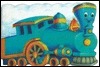 A shiny blue engine helps a train full of toys over a steep mountain.