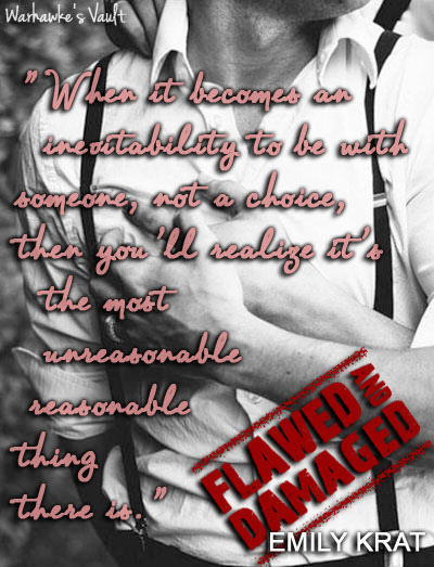 4 stars I was up to the wee hours of the night because I had to finish this story. I had a feeling I would get my HEA, but I had to see for myself and live through it. Flawed and Damaged is a love story more than anything else, about two people who don’t think they are worthy of the epic love they find in each other. It frightened them, yet made them whole and happy. My heart was sad, it hoped, and it was full…which made for a great read.