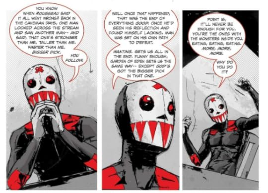 This is an extremely violent and graphic (pun intended) novel. In the opening scenes a whole theatre full of people have been murdered, while Madder Red waits patiently for the local superhero to show up.