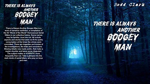 There is Always Another Boogey Man is a work of narrative nonfiction, a compilation of the 50 “Worst of the Worst” Homosexual Serial Killers in our collective history. Some names may be familiar, most are not. All include aspects and stories that were not fit for public consumption at the times the crimes were committed. There are tragedies and ironies of the investigations, the trials and convictions. Missing details now made public, that make a reader shudder and leave some disgusted. The subject matter is HORRIFIC more frequently than not. Take a glimpse into the dark minds of serial killers, who prey on boys and men.