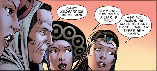 Aside from Coulson, Fitz is the only TV character that seems to have any traction on achieving crossover worthiness. Is it because he’s given more page time than Simmons and May or is it because Waid does better with a male, quirky, science geek type? Don’t get me wrong, I love both May and Simmons on the show, but their comic book versions have fallen short of the mark as presented here.
