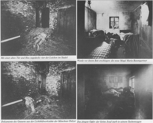 On March 31, 1922, six people were viciously attacked and killed at the Hinterkaifeck farm. The father and mother, Andreas and Casilia Gruber, their daughter, Viktoria Gabriel, Viktoria's two children, ages 6 and 2, and the maid who had begun her employment that very day were the victims.