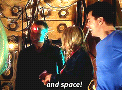 We finally get a glimpse of the adventures that took place between episodes 'The Doctor Dances' and 'Boom Town'. If you recall, in 'Boom Town' the three land in Cardiff to recharge and they meet up with Mickey. It's clear they have gone on quite a few adventures between the two episodes, it is absolutely brilliant to play around in that time frame.