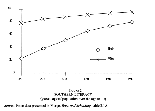 Esse livro trata da evolução da educação da população negra americana do fim da Guerra Civil até a década de 1960. Grosso modo, é possível dividir o período estudado em dois subperíodos. O primeiro, entre o fim da guerra e a eleição de 1876, é marcado pela forte mobilização de ex-escravos que teve como objetivo garantir a seus filhos o direito à educação que já era gozado por grande parte da população branca depois do movimento das commom schools iniciado em 1830. O segundo período, entre fins da década de 1870 e 1960, é o período mais importante para criação do sistema educacional para a população negra americana e coincide com os anos de maior opressão e maior limitação de direitos civis dessa população. É sobre esse último fato que todo o livro foi escrito. O autor tenta responder de que forma foi construído e quais as características de um sistema educacional criado para o benefício de pessoas que estavam alijadas de seus direitos civis mais básicos. No caminho, ele apresenta uma boa discussão sobre a tentativa de brancos controlarem o tipo de educação que era dado à população negra, a resistência negra a esse controle e, sobretudo, o papel desempenhado pelos próprios negros na construção de escolas para suas crianças. A história é impressionante e acaba contando uma saga de heroísmo que, ao fim, tem um final feliz, apesar de todos os problemas enfrentados. A população negra americana, que já era mais educada que a população branca brasileira no início do século XX passa, já na década de 1940, ao nível de paridade com os brancos americanos em termos de acesso à escola. Em que pese o fato de que as diferenças na qualidade ainda permanecessem elevadas. A figura abaixo (tirado de outro documento) resume essa história: