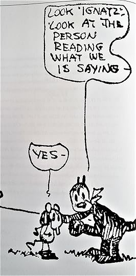 Krazy is, in fact, an American character, a fringe dwelling observer who can tell-it-like-it-is, a character of great sympathy who stoops to greet a worm. Krazy is Thoreau, Whitman, Dickinson. At times Krazy's dialect is Shakespearean, at others, it's the Blues. I want to read all the strips again.
