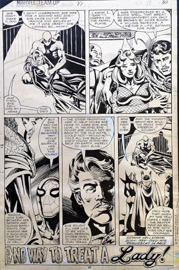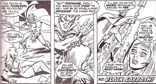 I was only tangentially aware of Son of Satan before this, him being a pretty fringe character in the Marvel universe. Let me tell you, I wasn't missing anything. Right from the getgo, he's somebody Marvel didn't really know what to do with. He has all the trappings of a superhero (confusing transformation, incredibly silly and unnecessary costume, stupid super powers, a mansion that would make Bruce Wayne blush) but I have to imagine he's for older readers, because what God-and Charles-Manson-fearing parent would let their child buy a comic book where Beelzebub appears on almost every cover? I mean I know this came out before the great Satanic Panic and everything, but 'cmon. (BTW, I think it's a real artistic mistake to show Ol' Scratch; he just comes off as a grumpy old dad, and it would've been better to leave him to the reader's imagination). At any rate, Son of Satan's tormented battle between his good side and evil side would likely be too confusing for a younger audience (it is for me, at any rate) and it usually just exhibits itself with him turning into a huge jerk and slapping around some woman who's invariably in love with him for no good reason.