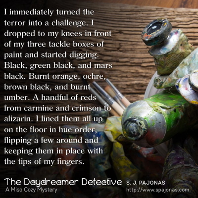 The Mount Fuji painting used to take up the space to the rear of my canvasses, but the wide wall stood empty, begging to be filled. I grabbed the top tackle box and popped it open. Tubes of acrylic paint lined the top tray, like I’d left them in there yesterday. Several were unopened and moved when I squeezed them, but a few had seized up. Wow. I was lucky! I’d heard acrylic paint could last ten years or more, especially if they were kept in the fridge, but the temperature fluctuated up here and I expected worse.