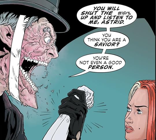 In this issue: More about Astrid’s youth and her meeting of the mysterious young woman named Anika; Astrid’s brother, Peter, shoots her during a TED talk; Chloe starts dating Detective Demakos, who is freaked out because the body of the pretzelized homeless man has two right hands; Astrid’s bodyguard, Duncan, has been compromised by one of the demon-things; there’s a pony-man hybrid that gives me daymares; some whacko religious-nut CEO of a bottled water company wants to take over Astrid’s company; Chloe tries to save Spark, the demon-thing who she is trying to convince everybody is actually a good guy—-er, good “thing”, or whatever; Astrid’s people find Peter’s baby—Astrid’s niece—-which has snakes for a head.