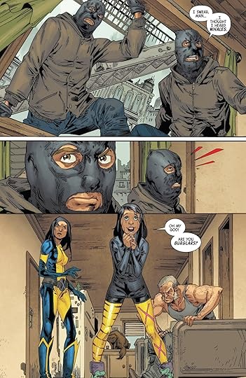 In the exact middle of Volume 2: Civil War II the main plot takes an unexpected 'time-out' as two masked burglars unfortunately enter the NYC apartment in front of Laura 'All-New Wolverine' Kinney. (Also present is 'sister' Gabby, co-star from the previous volume who has similar abilities, and a man who is possibly the reappearance of Logan, a.k.a. the original Wolverine.) That was the buglars' first mistake. Then they brandish their pistolas to the familial trio. That was their next mistake. Then they open fire. And that, dear readers, was the last mistake they'll ever make. SNIKT!
