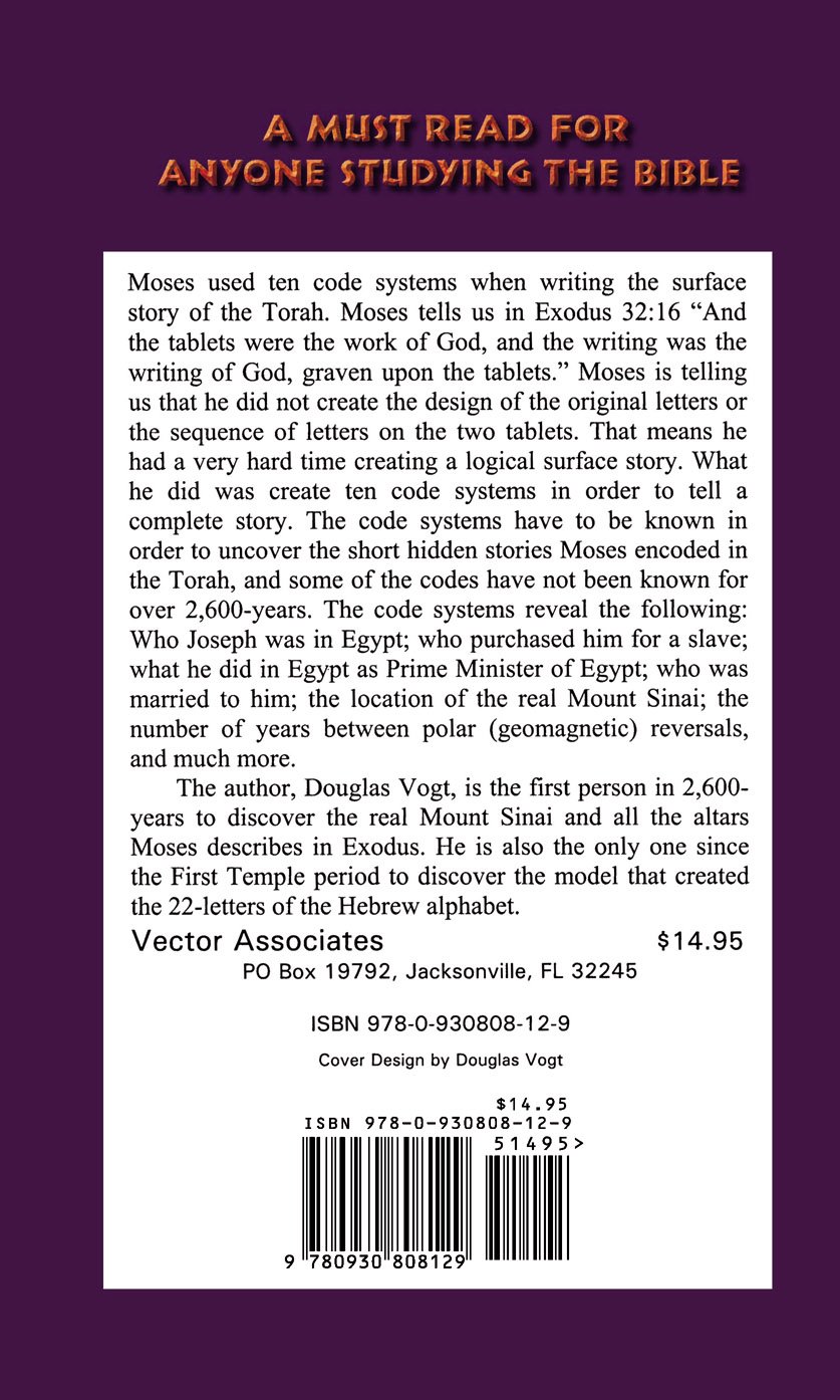 Moses used ten code systems when writing the surface story of the Torah. Moses tells us in Exodus 32:16 “And the tablets were the work of God, and the writing was the writing of God, graven upon the tablets.” Moses is telling us that he did not create the design of the original letters or the sequence of letters on the two tablets. Moses created ten code systems in order to tell a complete story. The code systems have to be known in order to uncover the short hidden stories Moses encoded in the Torah. Some codes have not been known for 2,600 years. There are 4 videos on Youtube that describe some of the material covered in the book. Part 1: Part 2: God’s 11th code can be seen Part 1: & Part 2: The code systems reveal the who Joseph was in Egypt; who purchased him for a slave; what he did in Egypt as prime minister; who was married to him; the location of the real Mount Sinai; the number of years between polar (geomagnetic) reversals, and much more. The author, Douglas Vogt, is the first person in 2,600-years to discover the real Mount Sinai and all the altars Moses describes in Exodus. He is also the only one since the First Temple period to discover the model that created the twenty-two letters of the Hebrew alphabet.