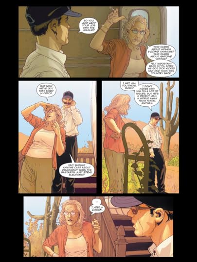 Again, the artwork is amazing. It's like Sean Phillips if colored by Matt Hollingsworth. Tony Harris provides surgically clean lines, Tom Feister dramatic inks, and JD Mettler deep but somehow arbitrary colors. The artwork feels like A Scanner Darkly it's so crazy.